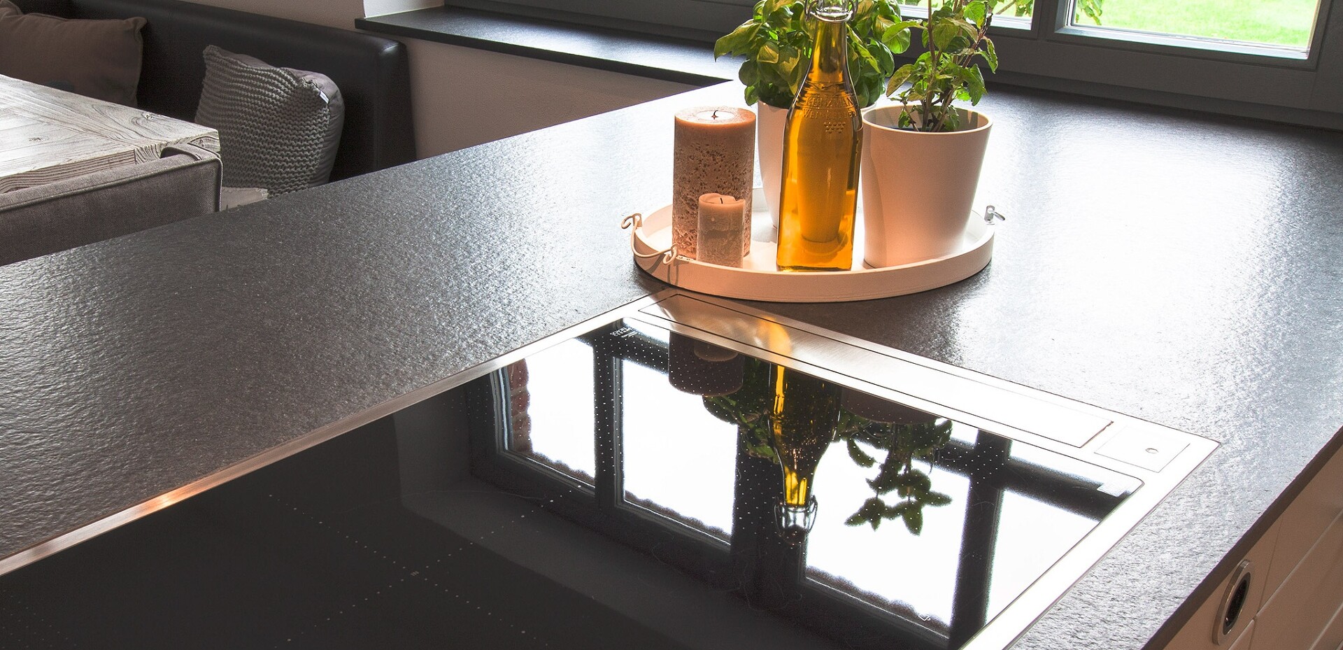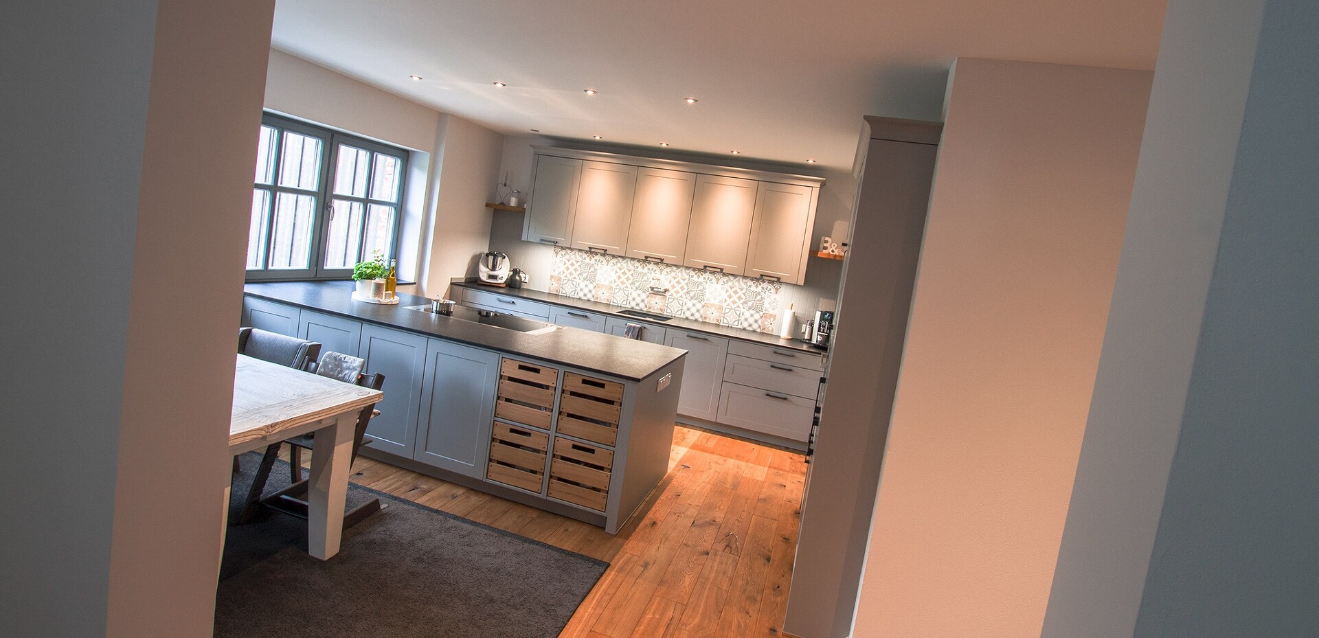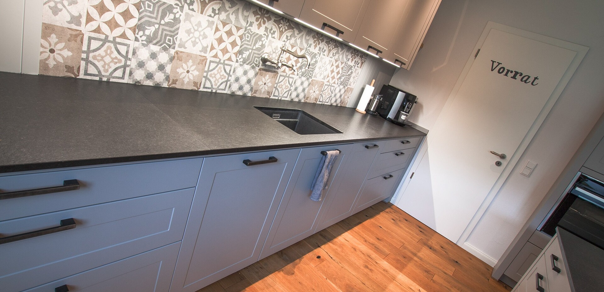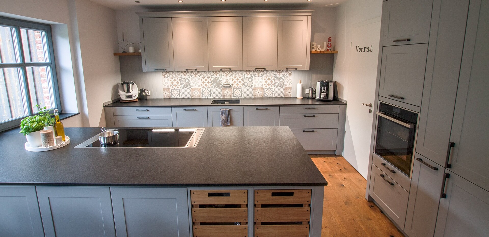 Mit Kalkstein hat unser Kunde den ganzen Tag zu tun, daher war es naheliegend, die Arbeitsplatte auch in Stein zu wählen. Alternativ allerdings  aus einem anderen Steinbruch ;)