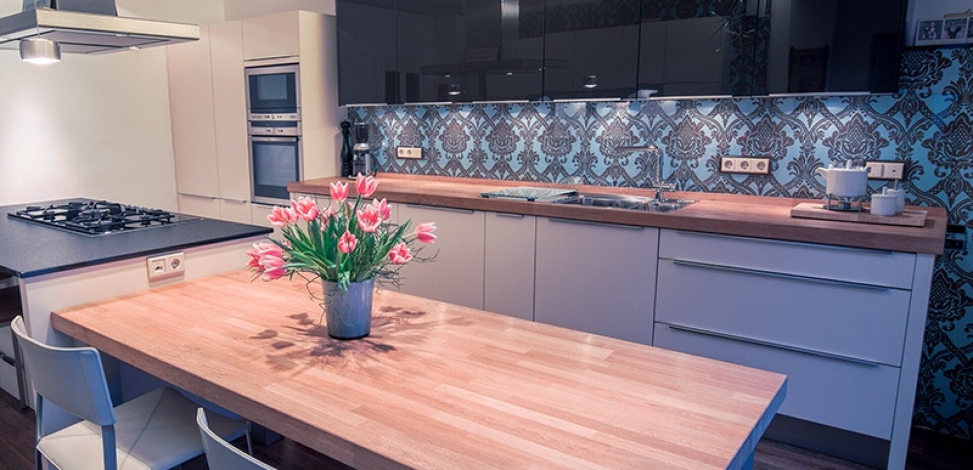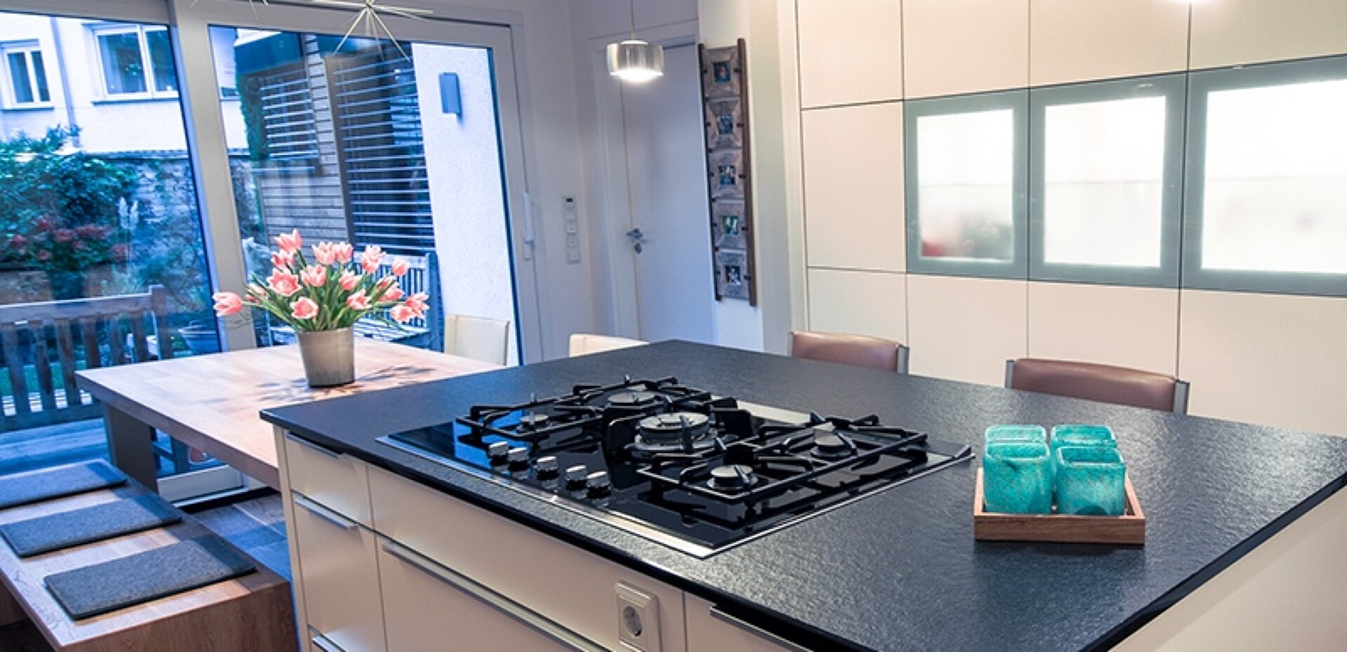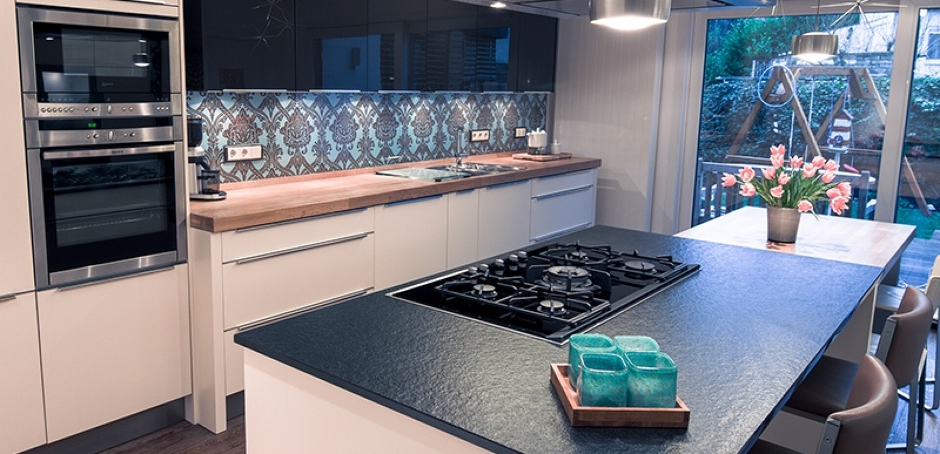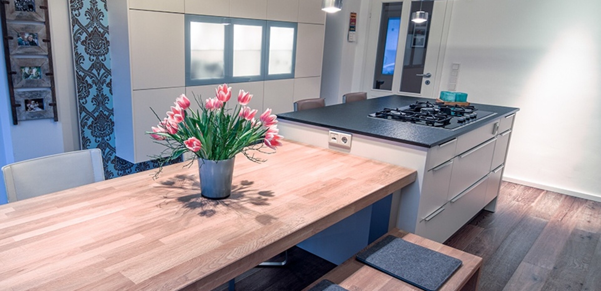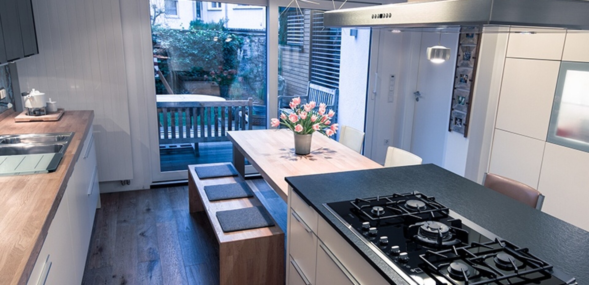 Wir sind wieder einmal in Paderborn. Im Erdgeschoss eines unscheinbaren Mehrfamilienhauses fanden wir eine Menge Potential versteckt. Frei nach Matzes Lieblingsmotto: "Mit Gebrüll auf den Müll!" flog erst einmal eine ganze Wand raus. So gab es genügend Platz für eine große Kochinsel mit einem extra breiten Gaskochfeld von 90 cm. Der massive Esstisch mit Bank wurde in unserer eigenen Werkstatt gefertigt und auch die Tapete haben wir geliefert...