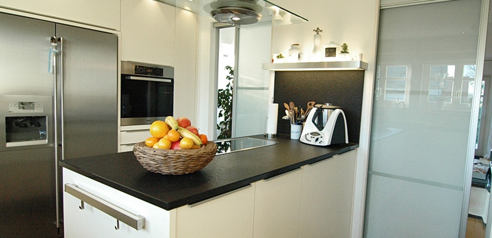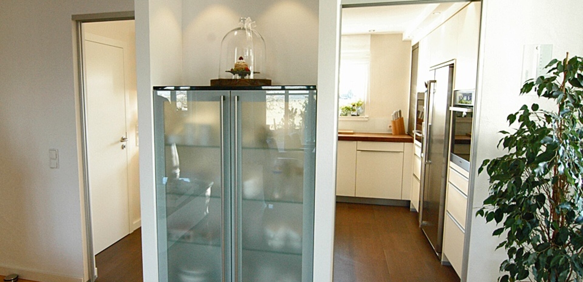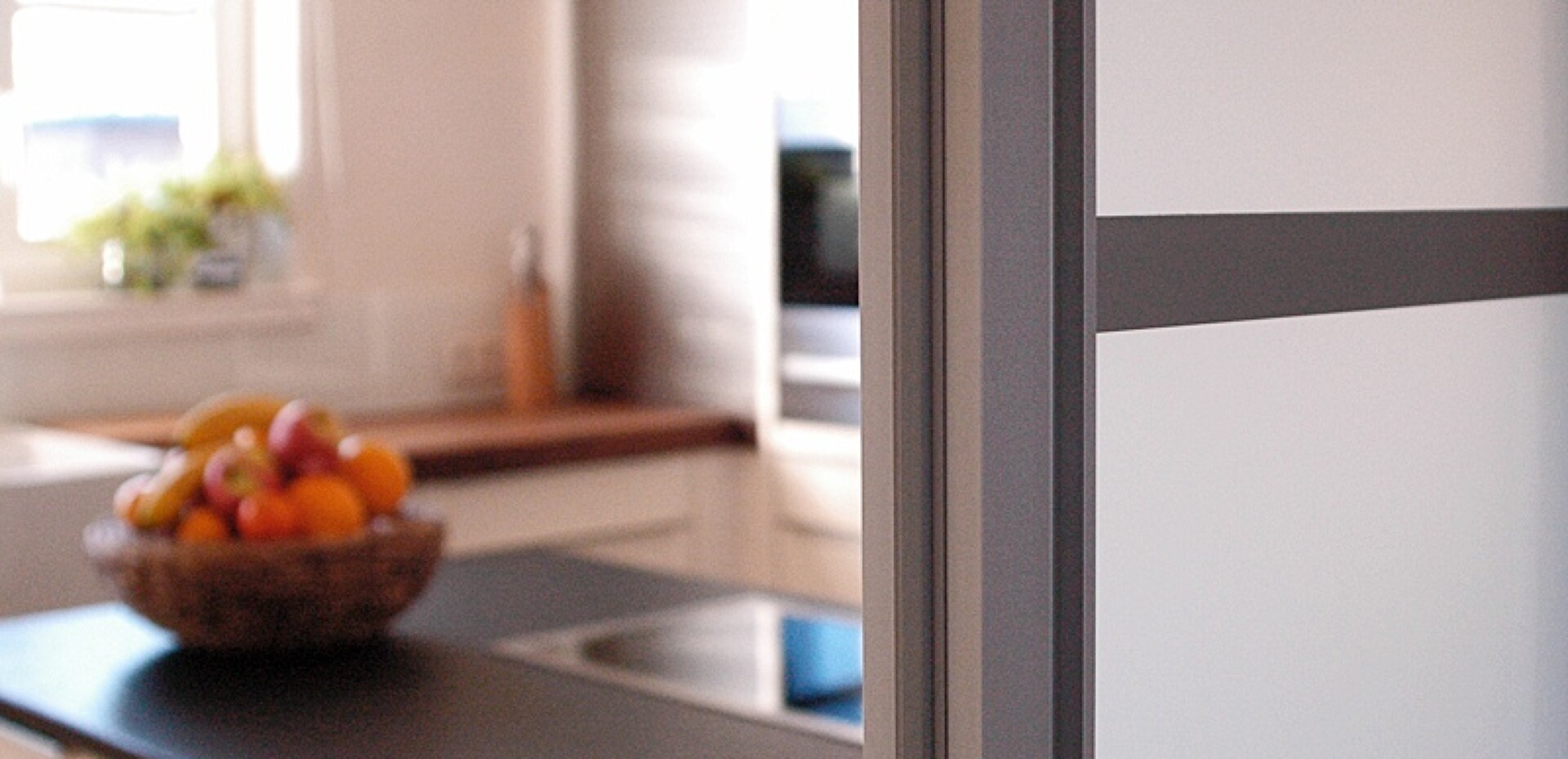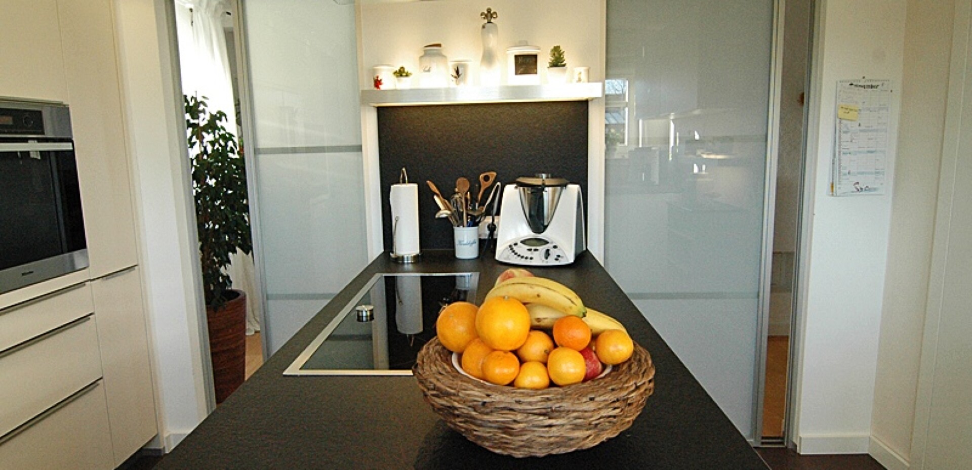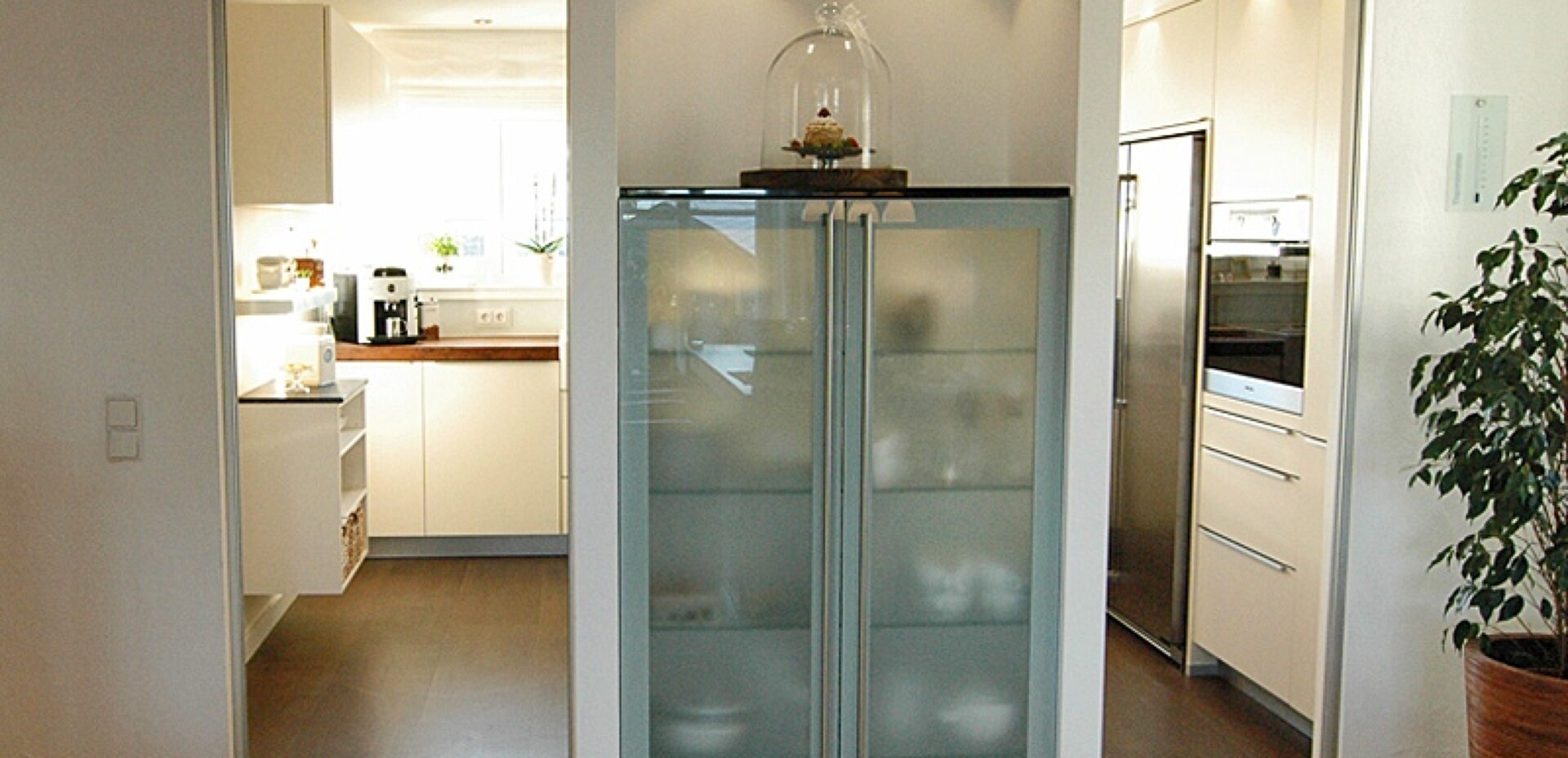 Links und rechts verschließt nun bei Bedarft eine satinierte Schiebetür den Küchenraum.