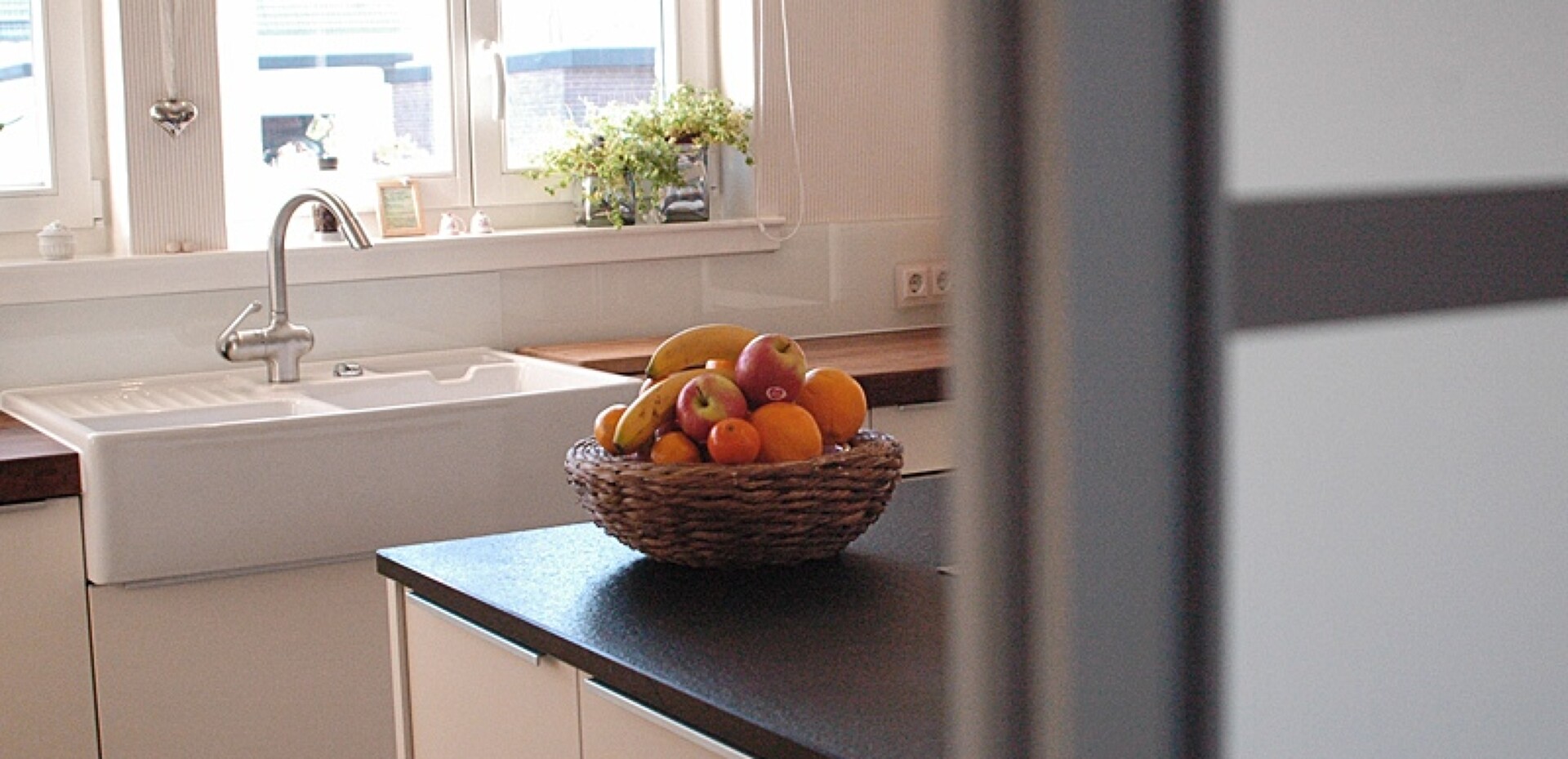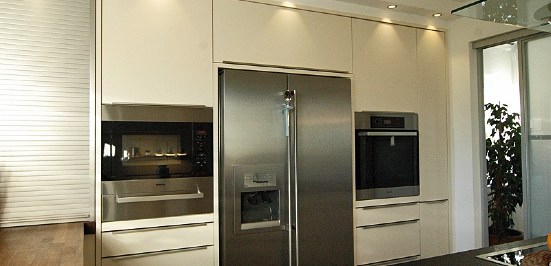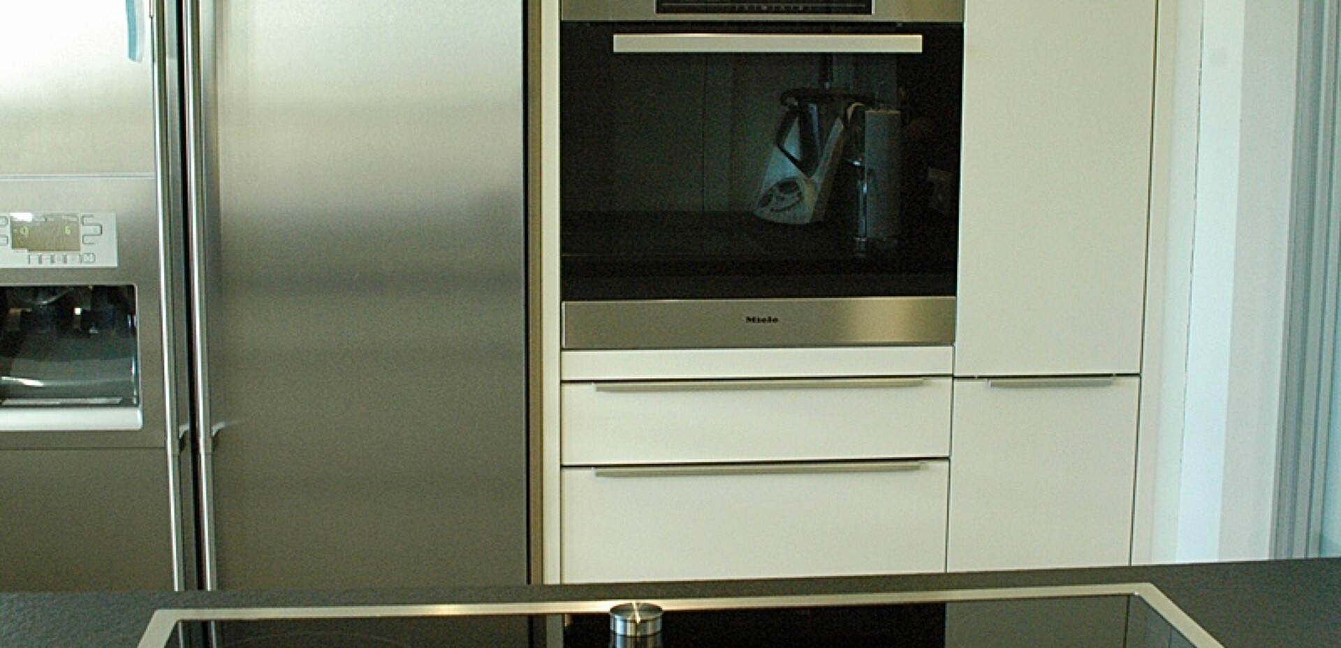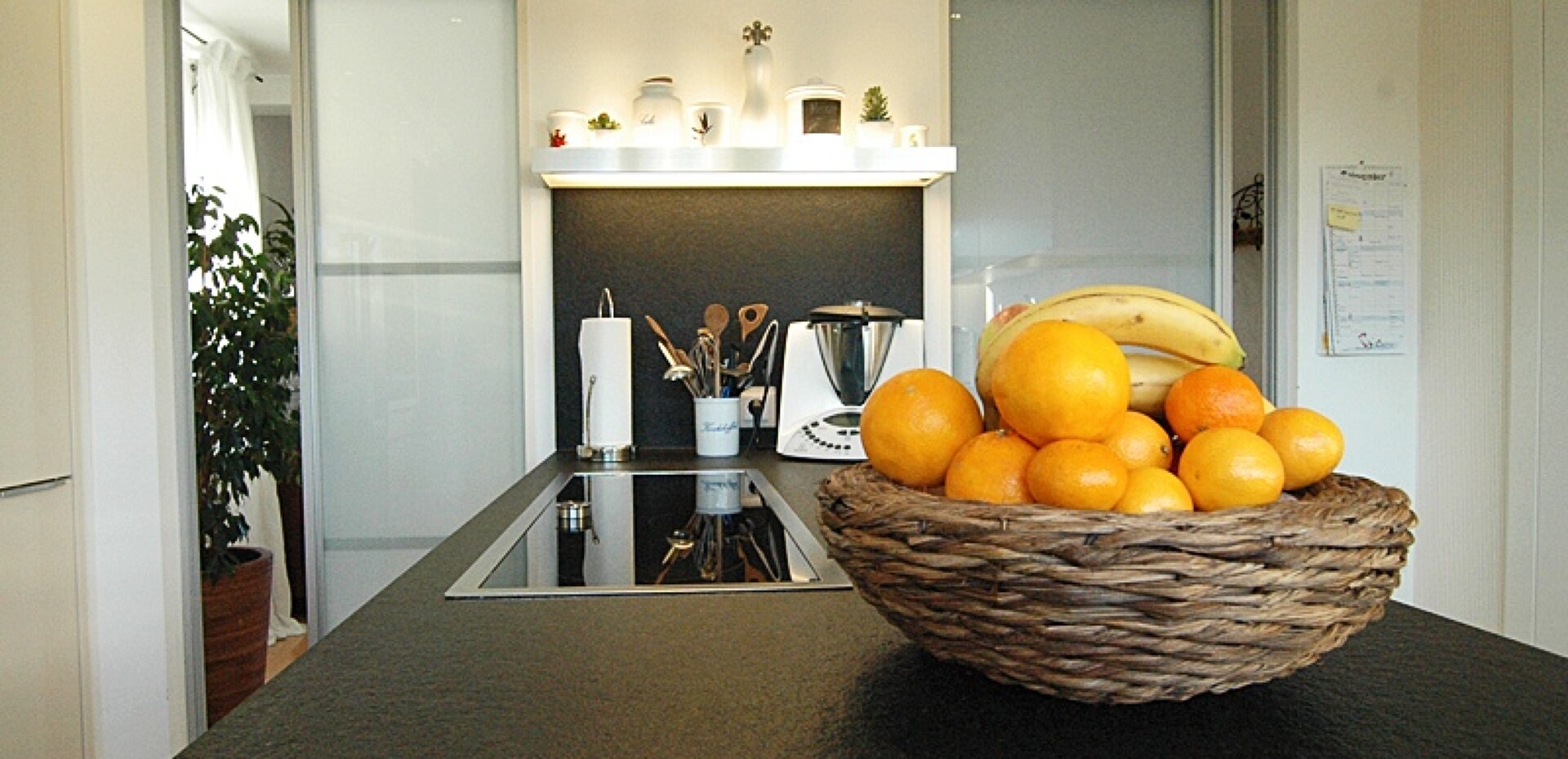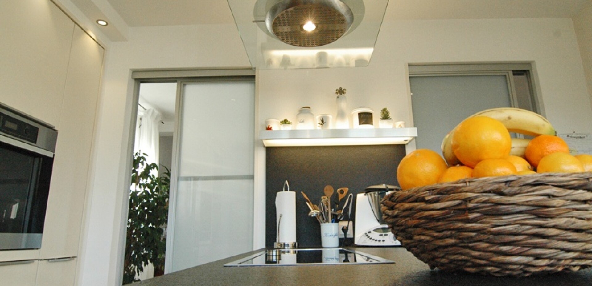 Links und rechts verschließt nun bei Bedarft eine satinierte Schiebetür den Küchenraum.