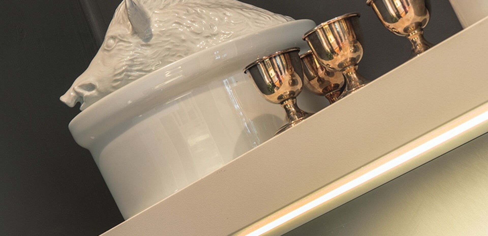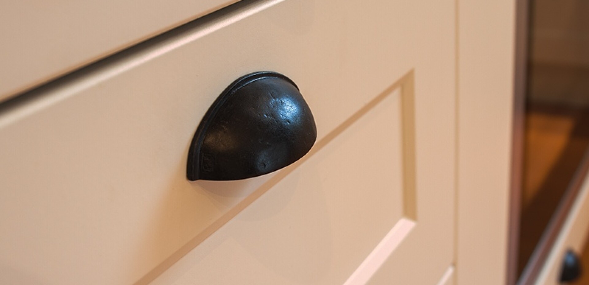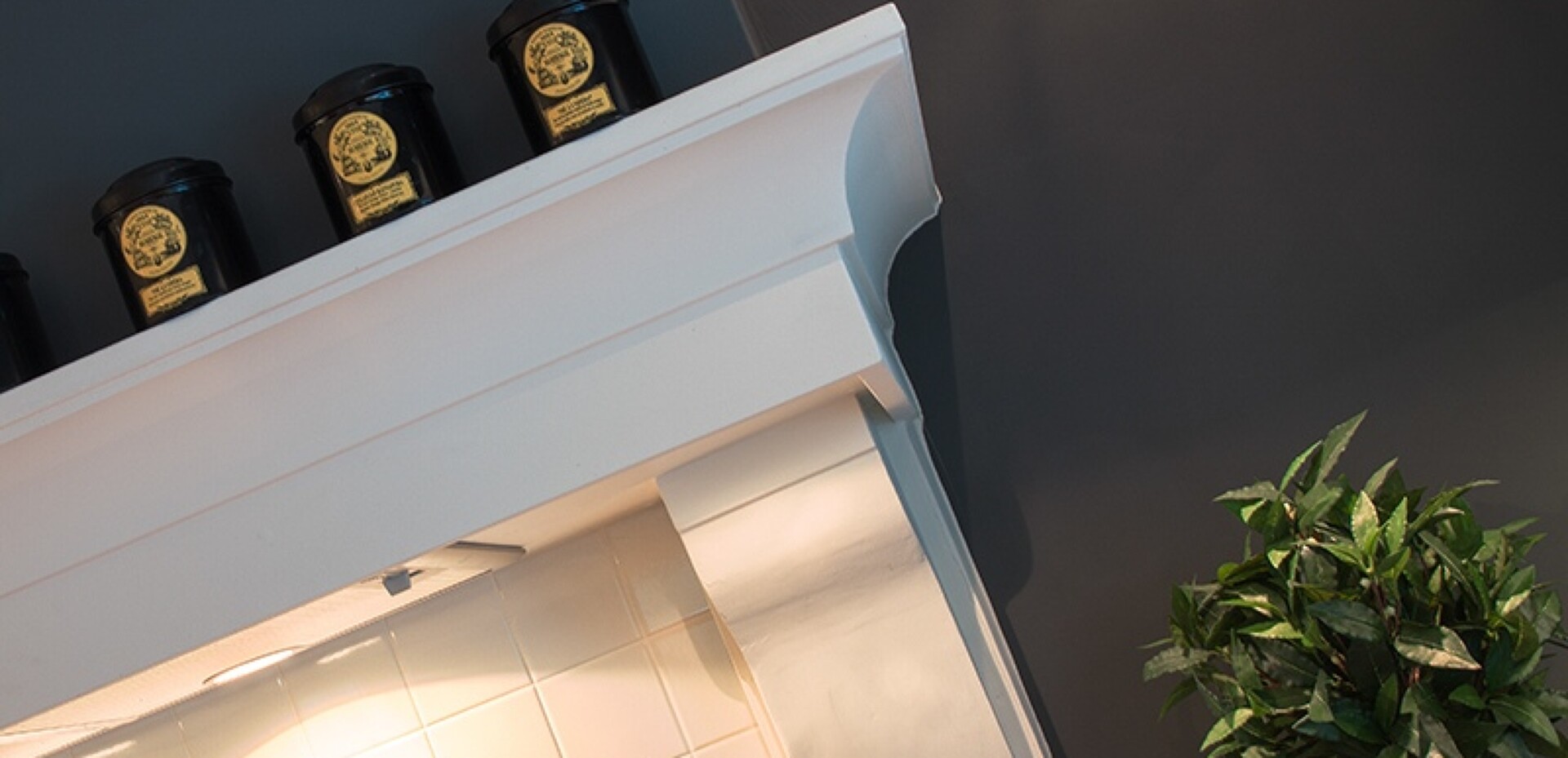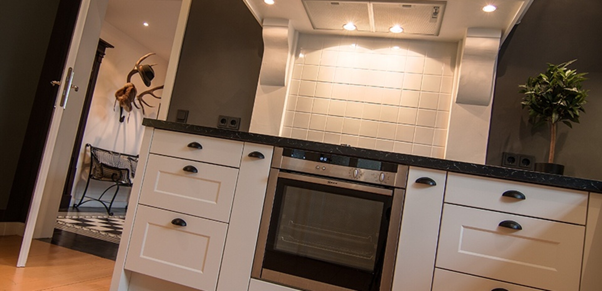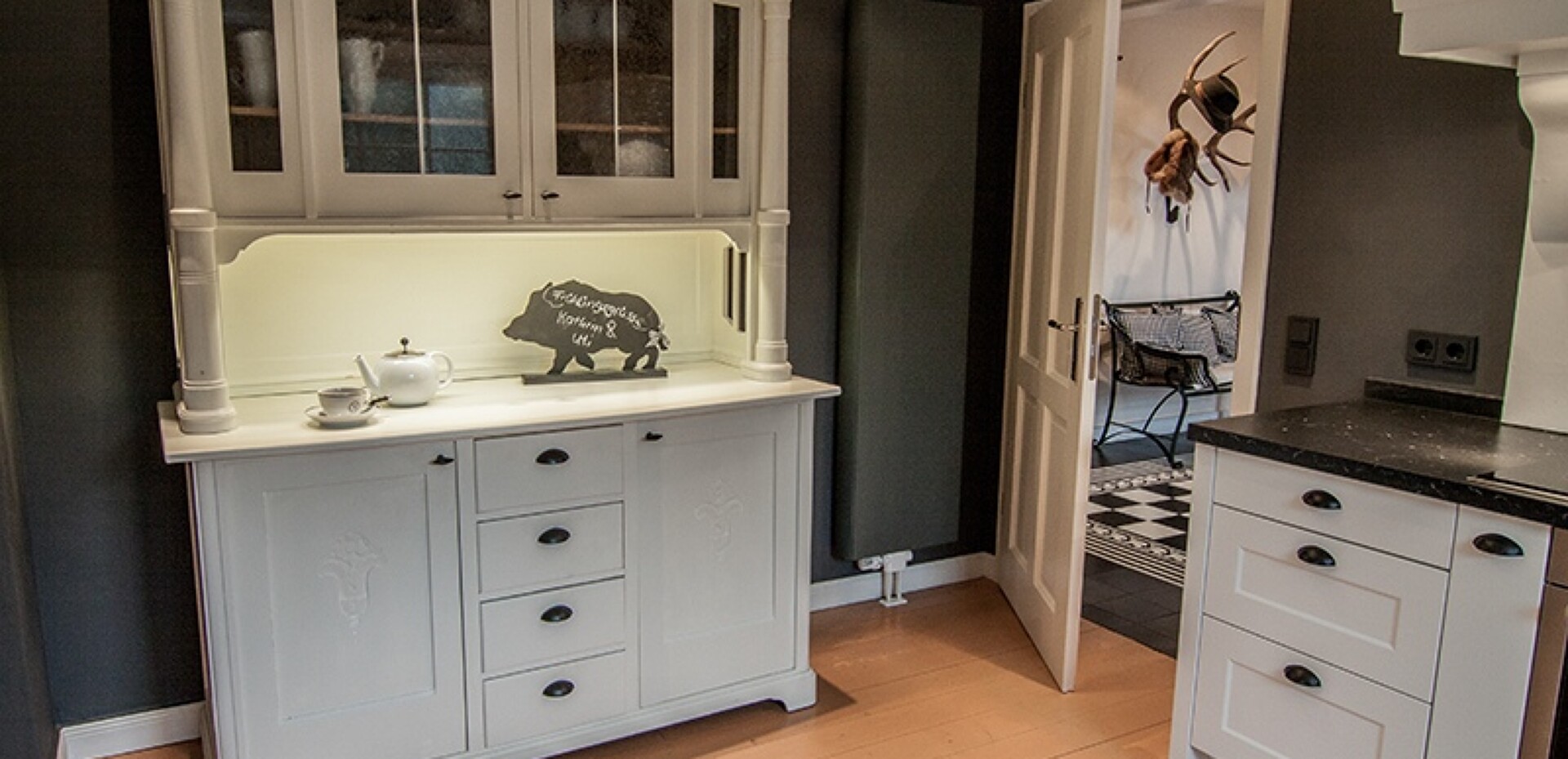 Das alte Küchenbuffet bekam die gleichen echt antiken belgischen Griffe wie die neuen Möbel und wurde auch farblich angepasst. So fügt sich alt und neu harmoisch ineinander. Der Kranz und der gesamte Umbau des Dunstabzugs entstanden in unserer hauseigenen Werkstatt.