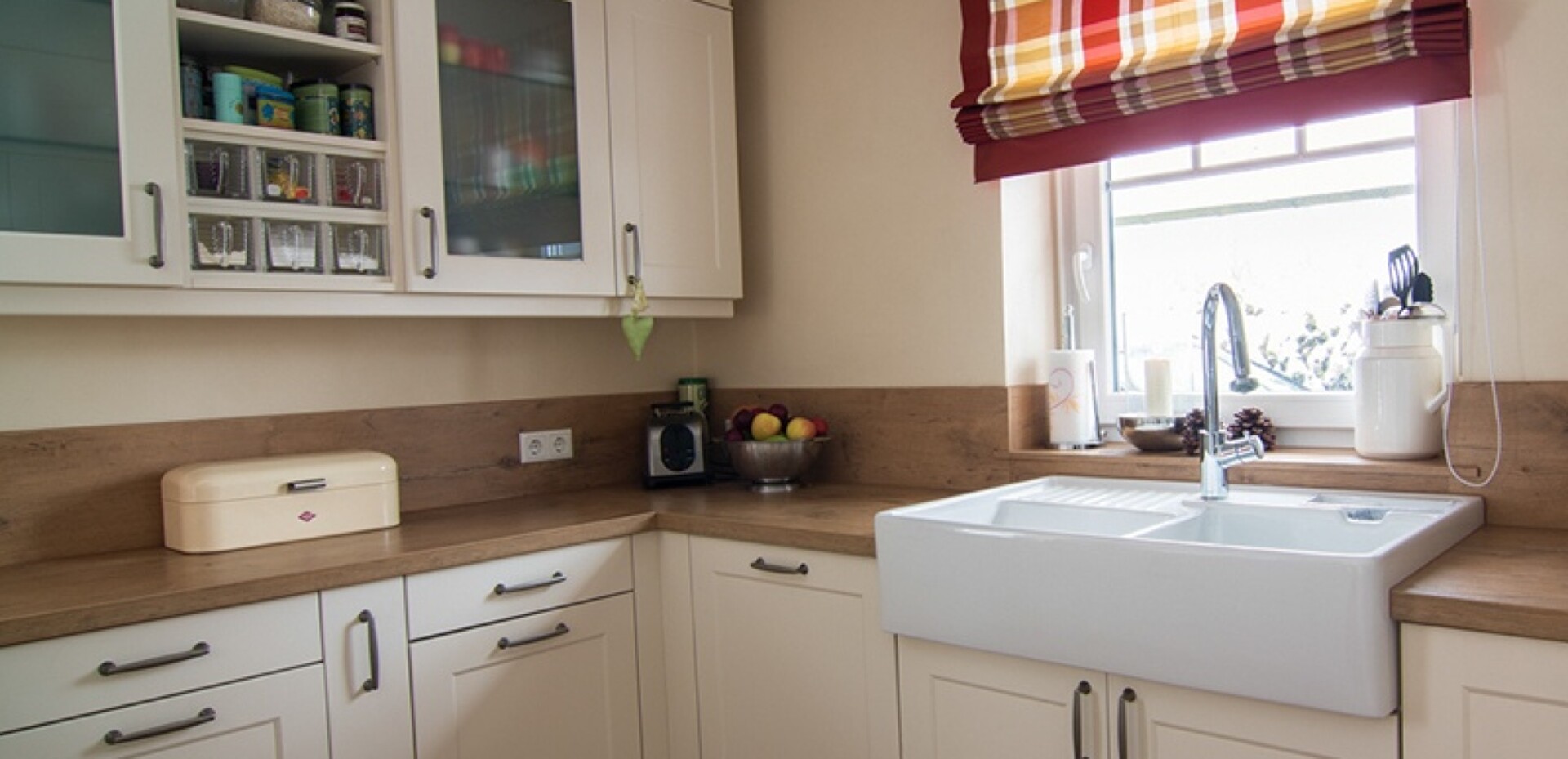 Bei dieser modernen Landhausküche fällt die tolle Kombination der verschiedenen Materialien ins Auge.