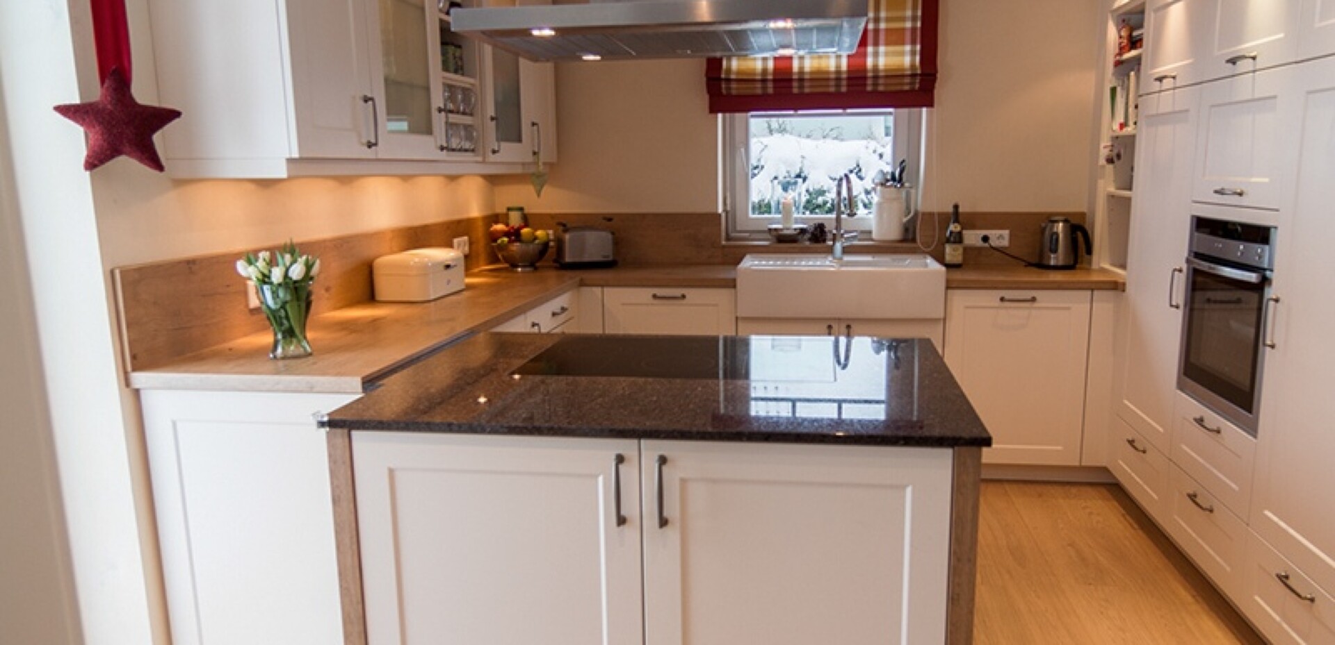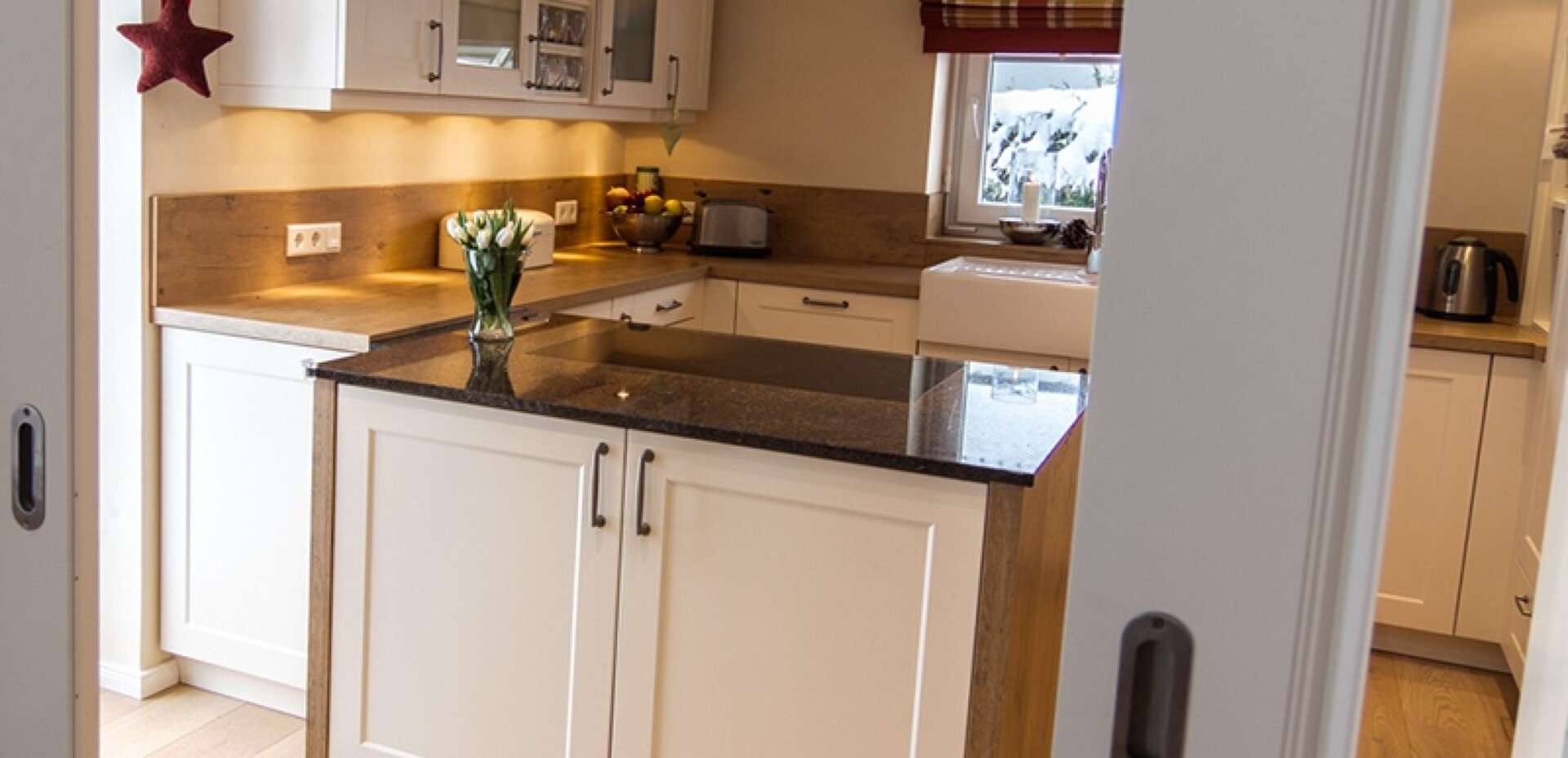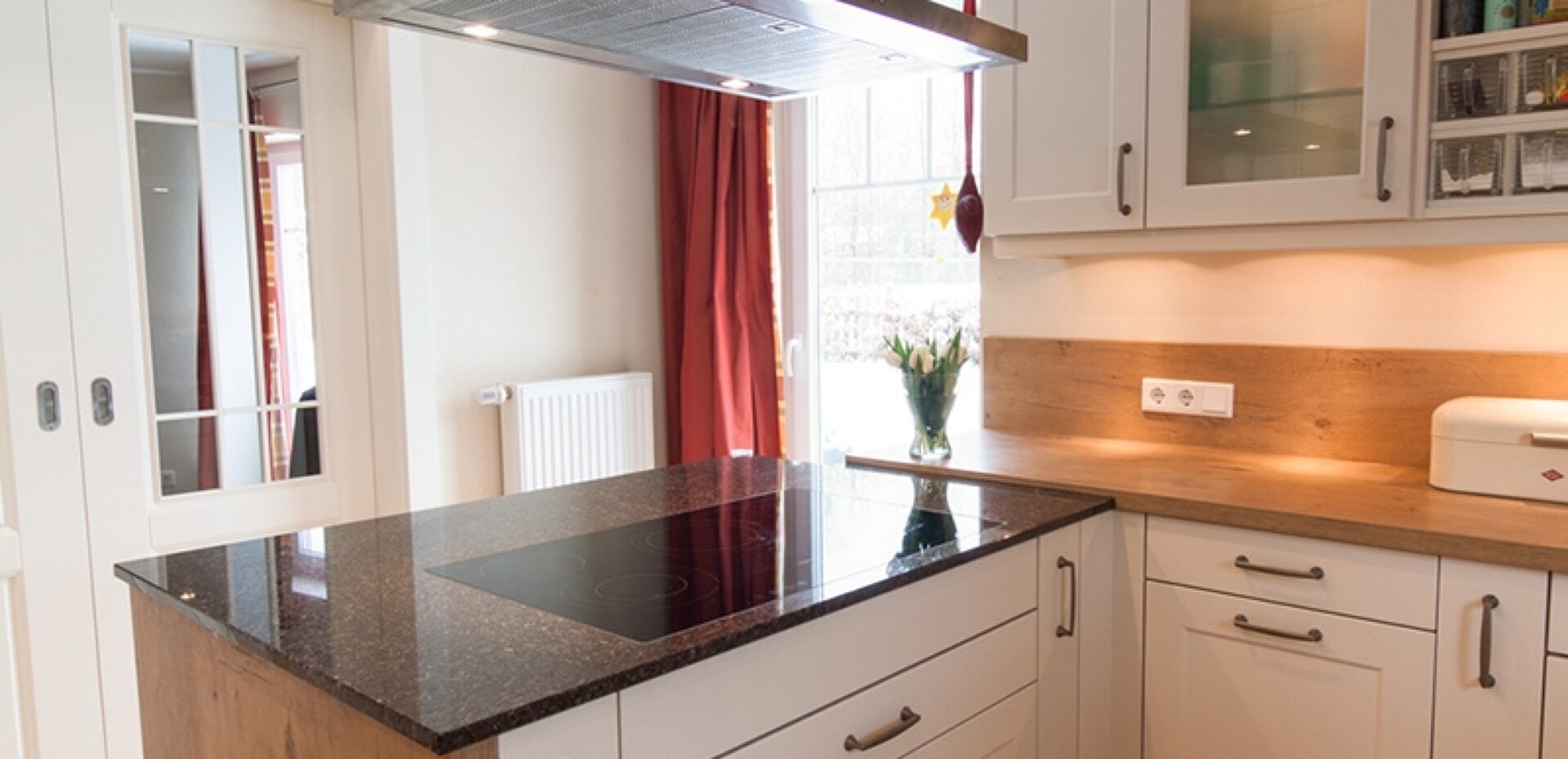 Besonders schön gelungen: der Plattenwechsel zwischen massivem Holz und Granit Coffee Imperial im Kochbereich.