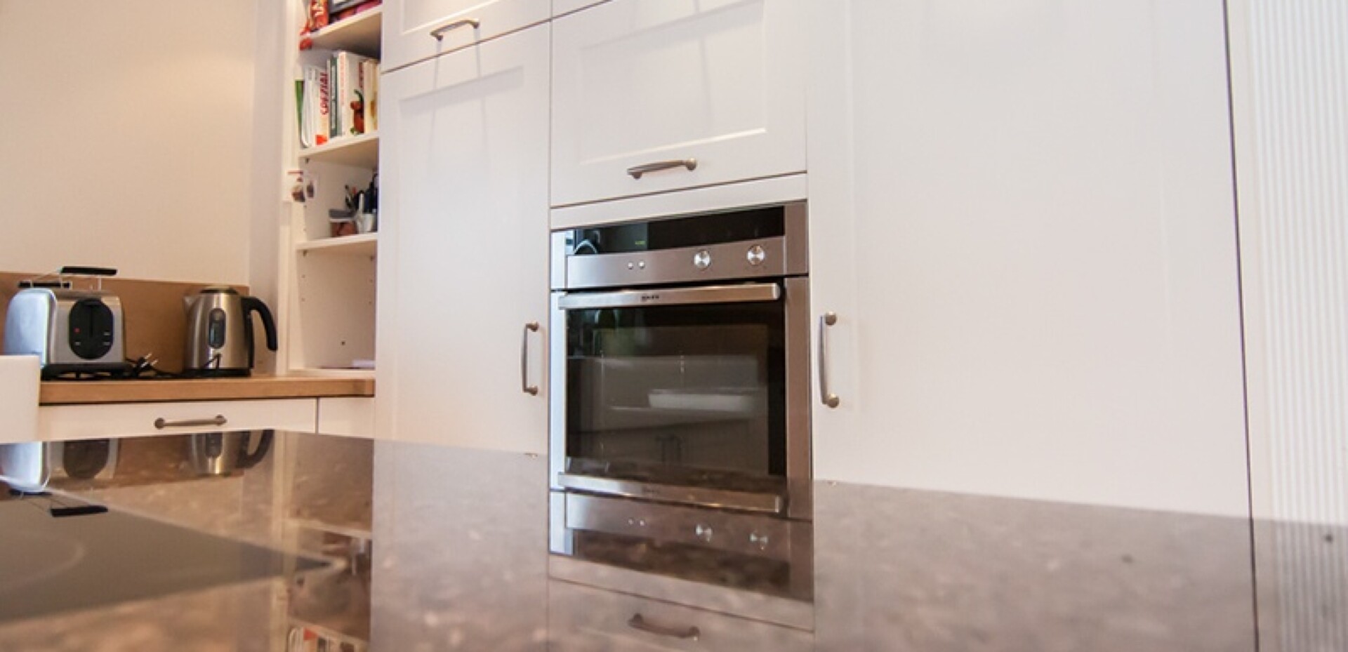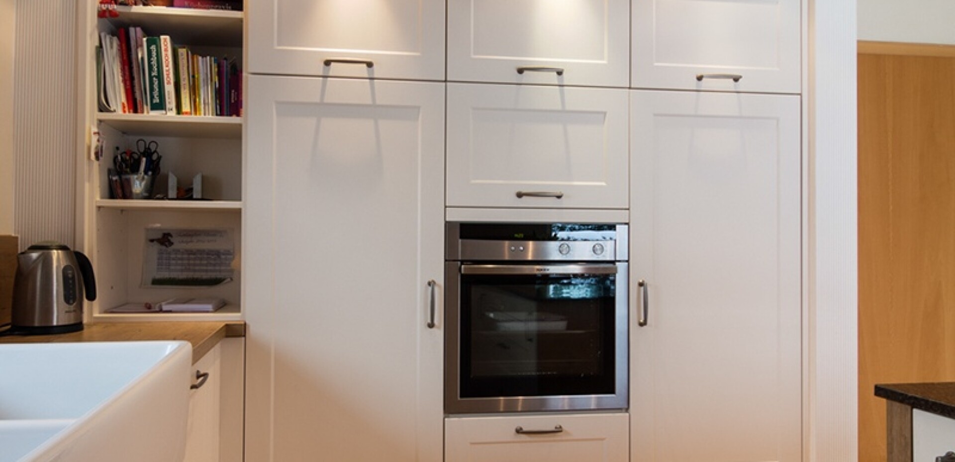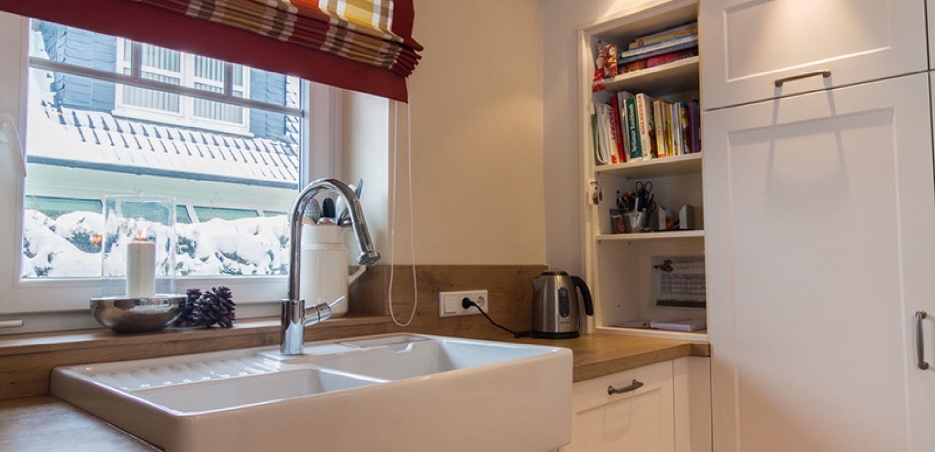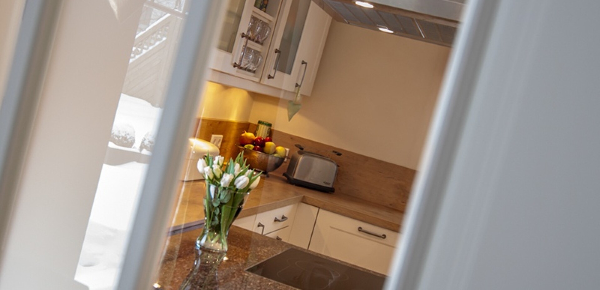 Besonders schön gelungen: der Plattenwechsel zwischen massivem Holz und Granit Coffee Imperial im Kochbereich.
