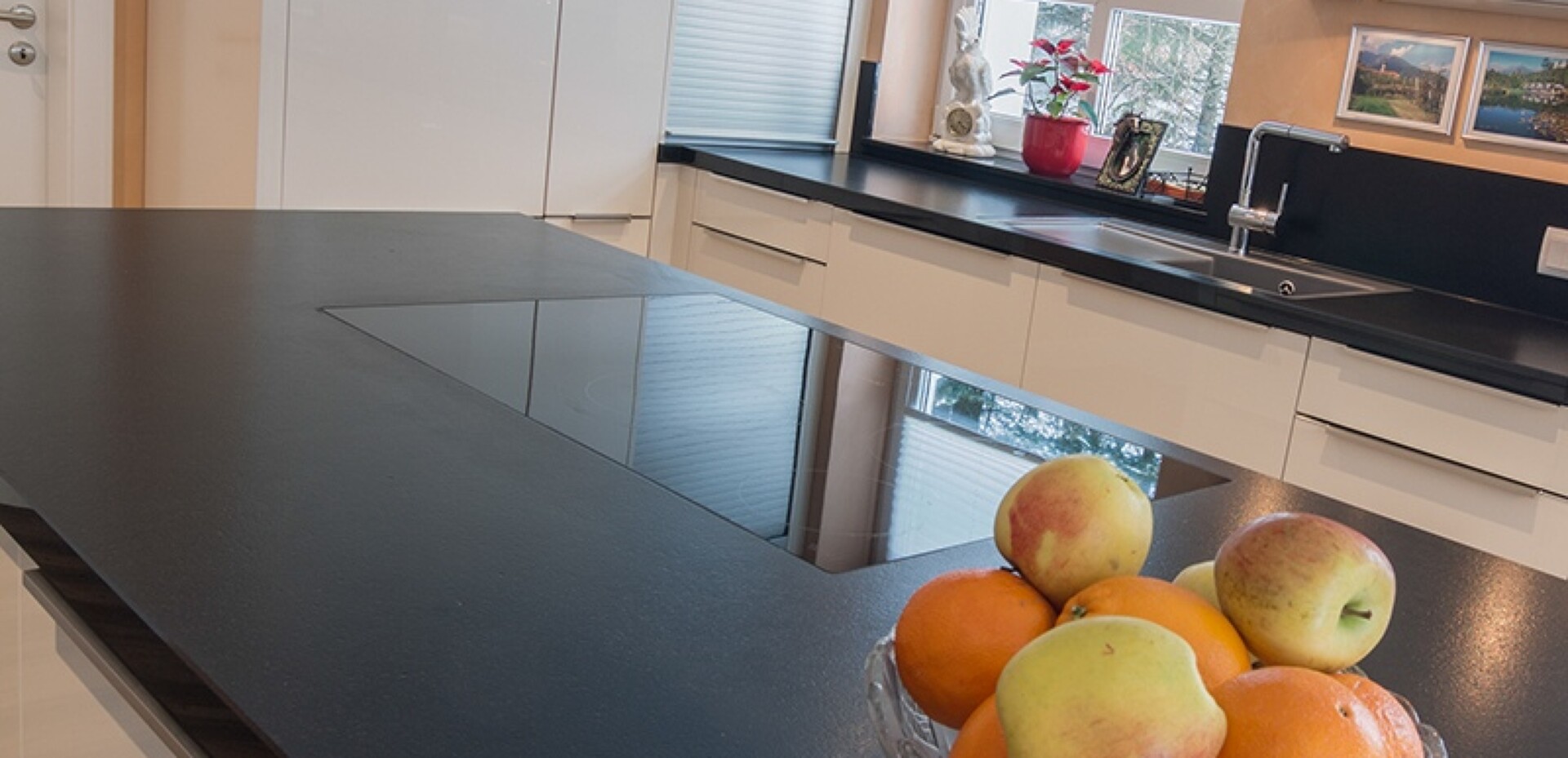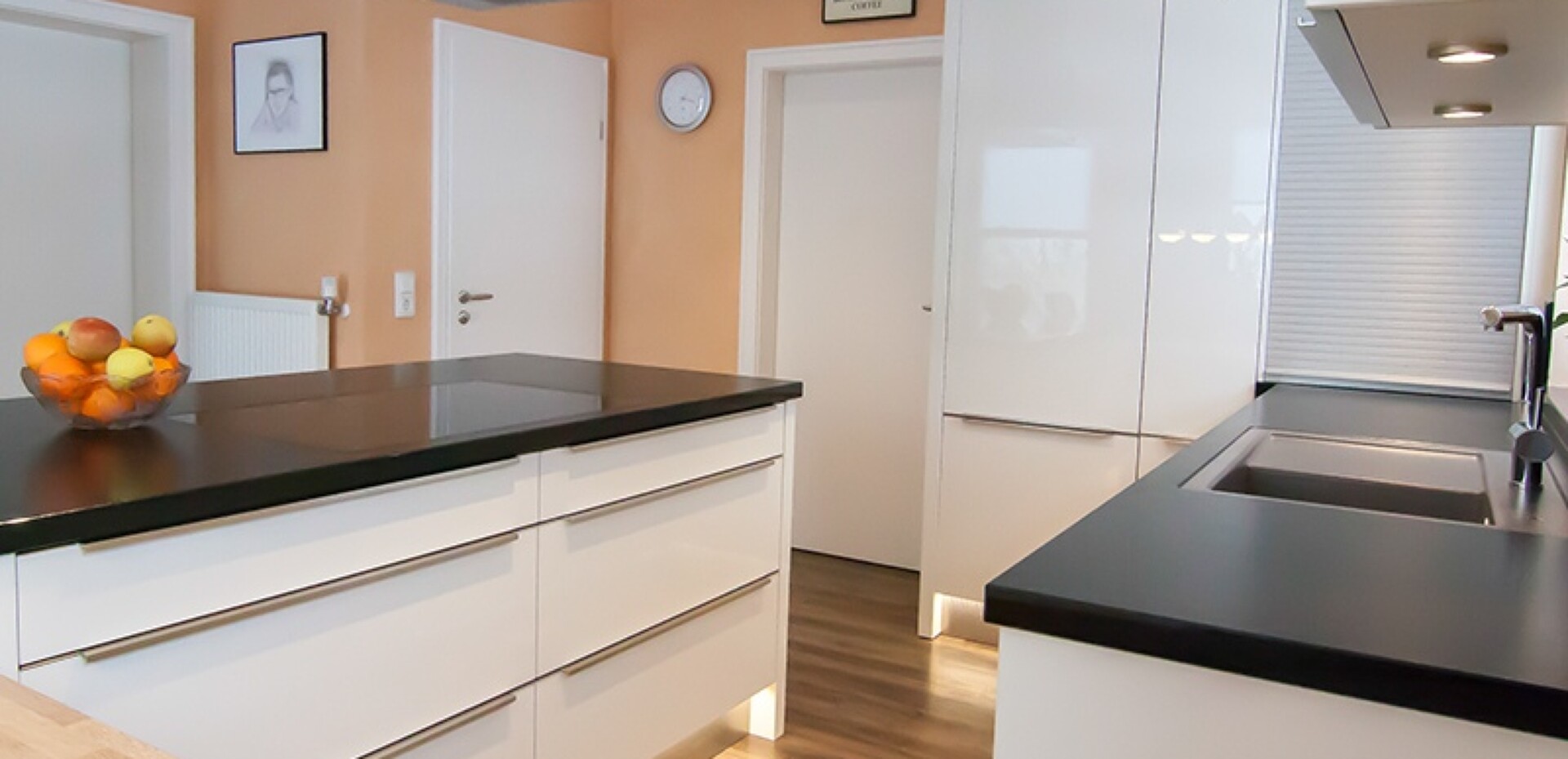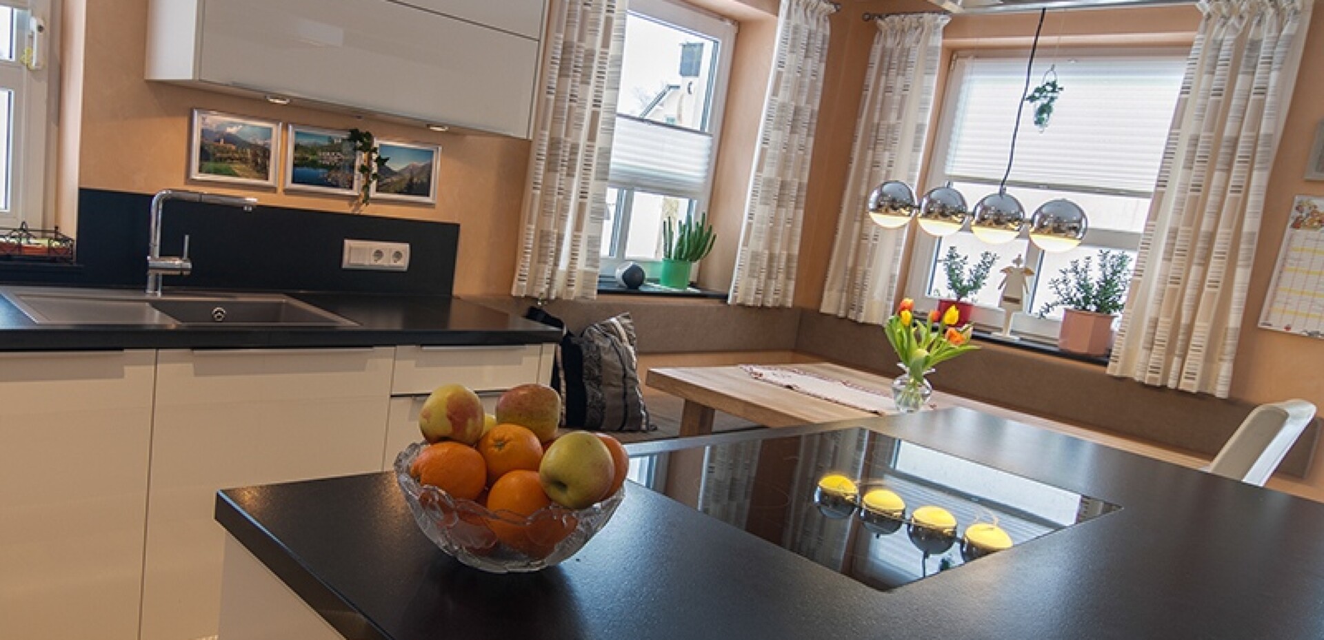 Viel Platz und eine große Kochinsel in Nero impala matt machen die Küche zeitlos, sachlich und elegant. Die Beleuchtung am Sockel sorgt abends für eine besondere Lichtstimmung.