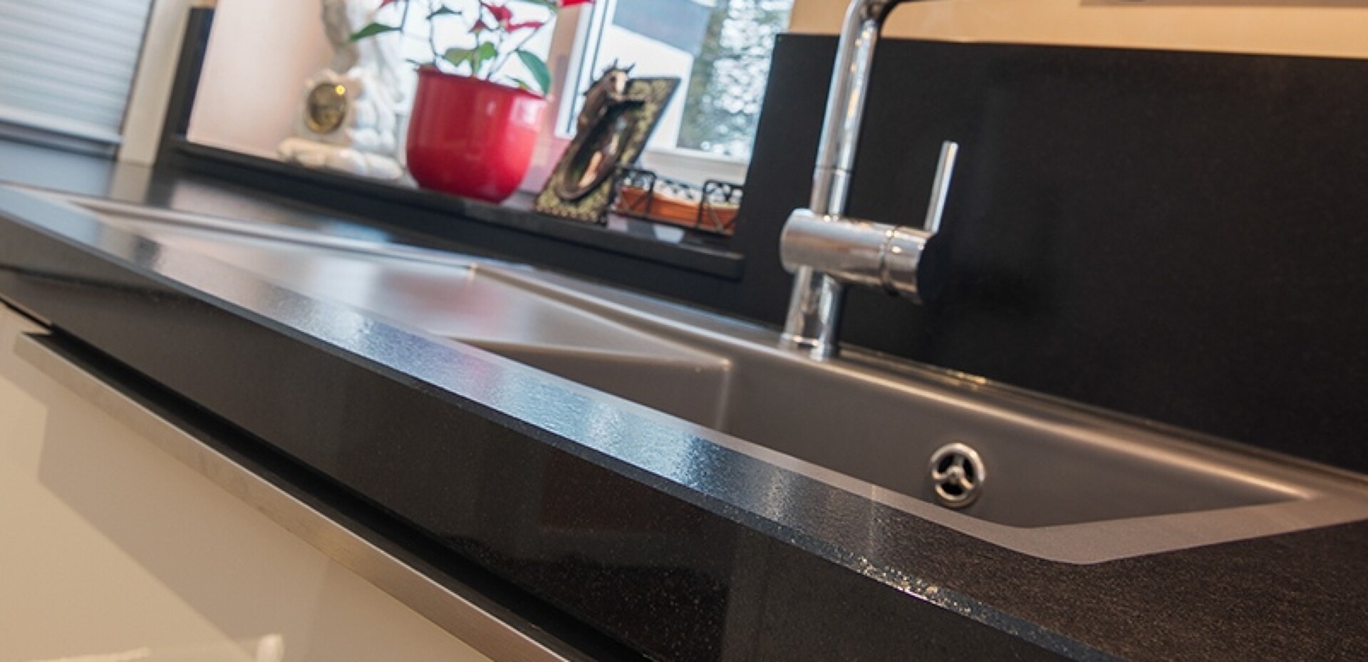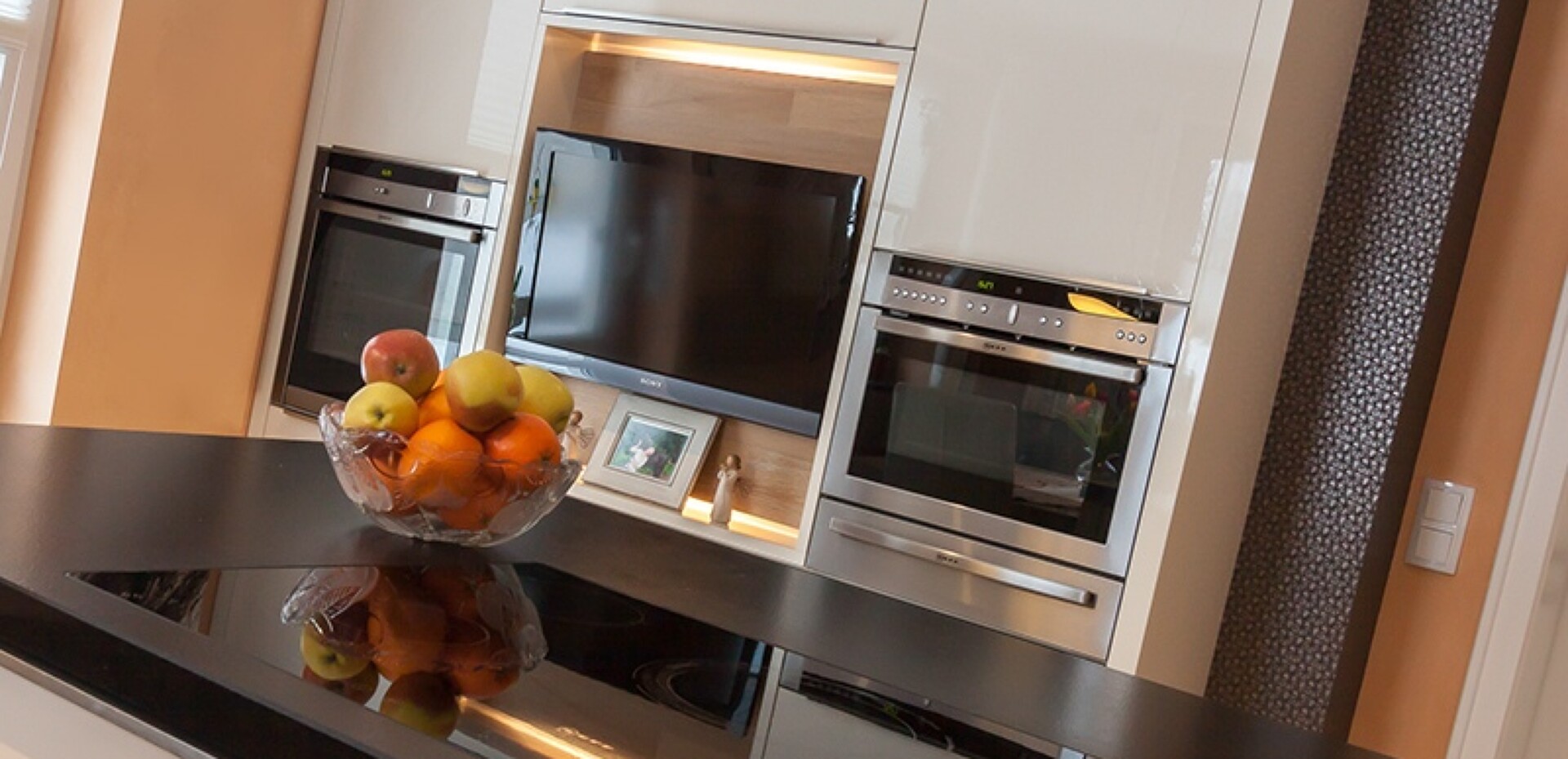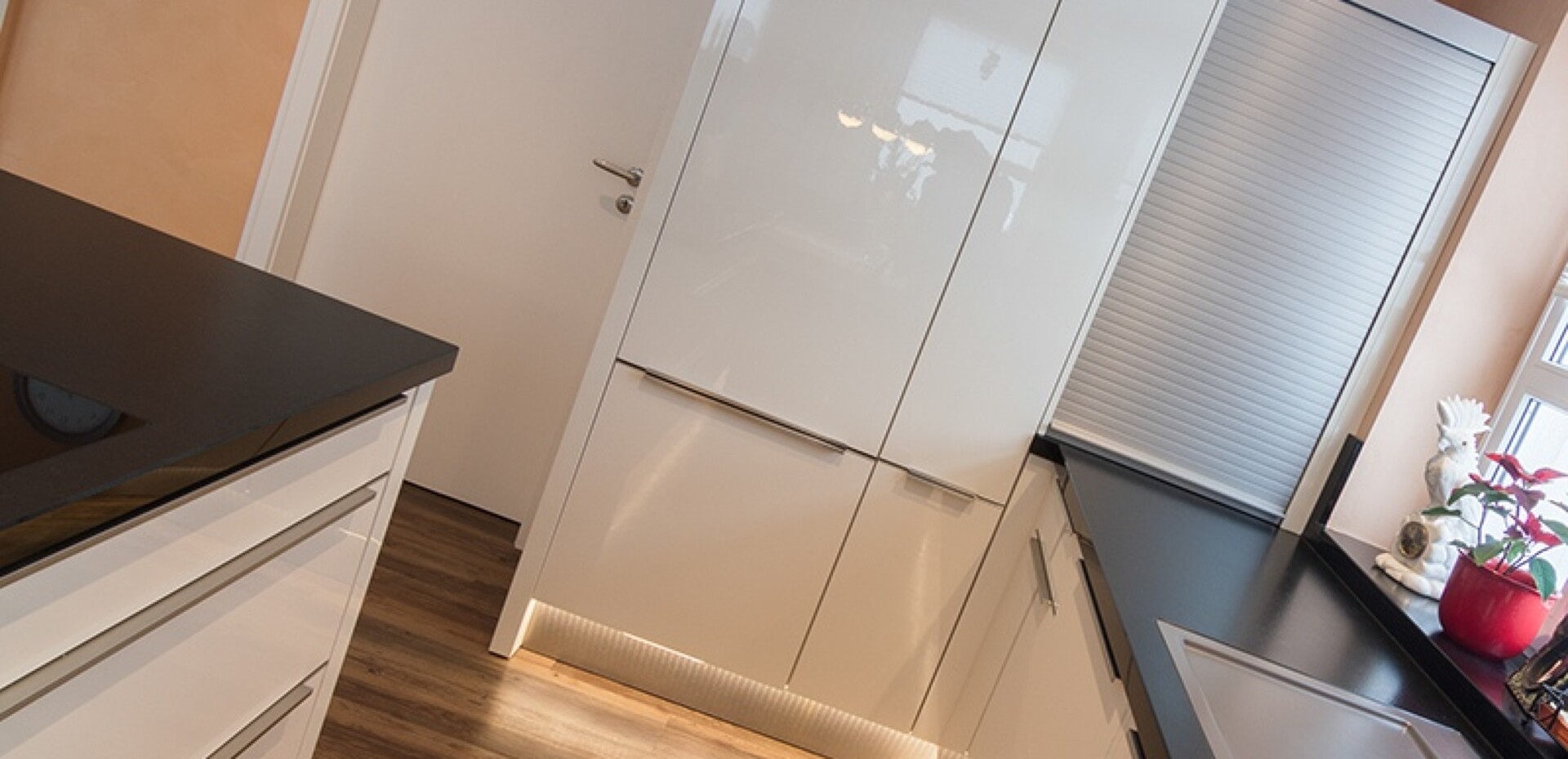 Viel Platz und eine große Kochinsel in Nero impala matt machen die Küche zeitlos, sachlich und elegant. Die Beleuchtung am Sockel sorgt abends für eine besondere Lichtstimmung.