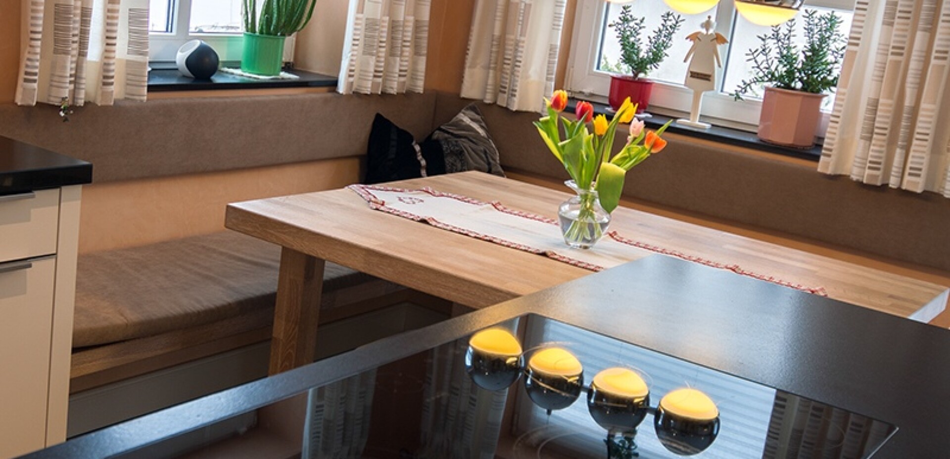 Eckbank und der Tisch aus Holz sorgen für die Gemütlichkeit.