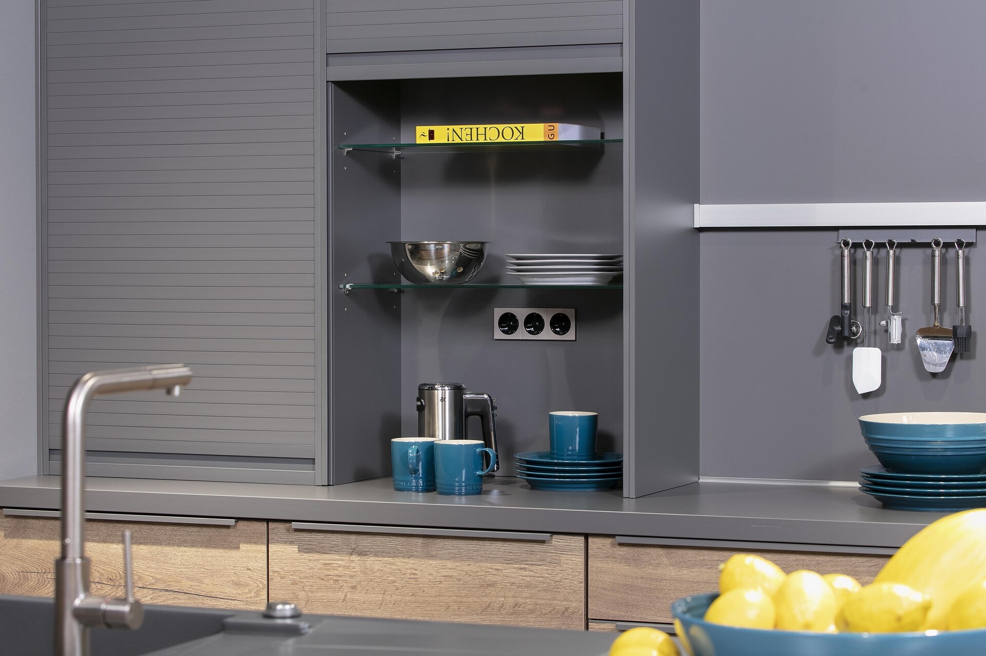 Zugegeben: So richtig neu sind sie defacto nicht, aber derzeit halten sie in neuer Bauform verstärkt Einzug in moderne Küchen. Die Rede ist von Rolladenschränken, und zwar solchen, die mit geringer Tiefe als Aufsatzschränke auf der Arbeitsplatte eingebaut werden.